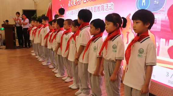 大隊輔導員宣布122名一年級小學生被批準加入中國少年先鋒隊,正式成為光榮的中國少年先鋒隊隊員,高年級的同學們做為老隊員為新隊員們佩戴上了鮮艷的紅領(lǐng)巾,當鮮艷的紅領(lǐng)巾佩帶在他們的胸前時,新隊員的臉上都洋溢著激動與自豪。