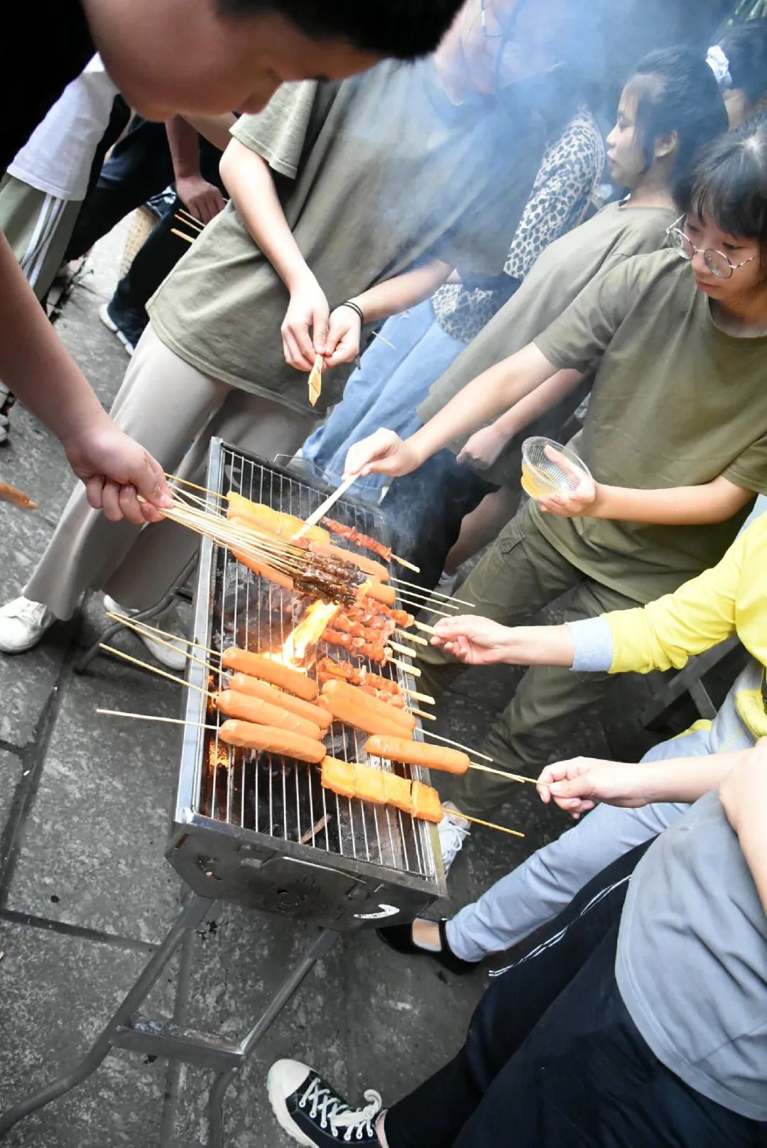 我們的重要嘉賓——科任老師陸續(xù)華麗登場(chǎng),一同共享午餐。這些誘人的燒烤食材讓人垂涎三尺,大家迫不及待地圍著燒烤架,想要立即把炭火燒起來。