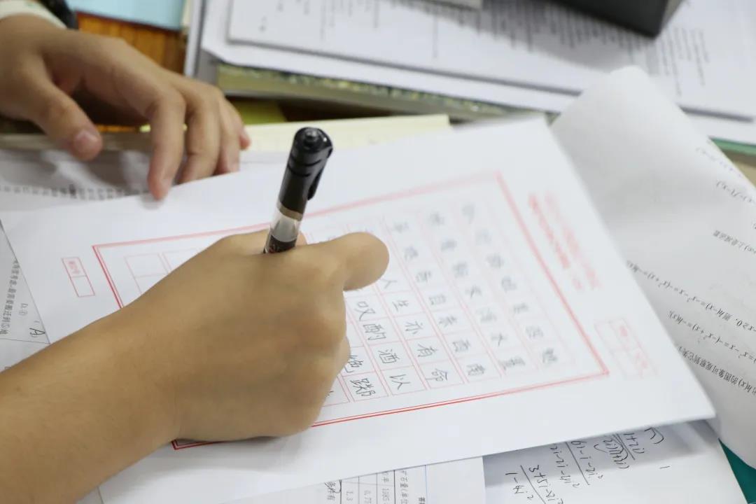 本次初賽除了語文課組老師作為評委外,還特邀了上一屆獲硬筆書法比賽第一名的韋家麗(2班)、張寶兒(4班)、牟星宇(2班)、何子嫻(3班)、于珊珊(2班)、劉語晴(4班)、王思淇(3班)、楊欣冉(3班)等8位學生作為小評委。初賽以班級為單位進行,每位同學都有資格參賽,賽后經評委選出入圍選手參與決賽。